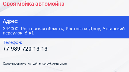 Своя мойка, автомойка по адресу 344000, Ростовская область, Ростов-на-Дону, Ахтарский переулок, 6 к1 в дальнейшем Организация, размещена в следующих категориях: