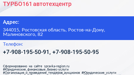 ТУРБО161, автотехцентр по адресу 344015, Ростовская область, Ростов-на-Дону, Малиновского, 82 в дальнейшем Организация, размещена в следующих категориях: