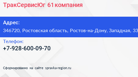 ТракСервисЮг 61, компания по адресу 346720, Ростовская область, Ростов-на-Дону, Западная, 33 в дальнейшем Организация, размещена в следующих категориях: