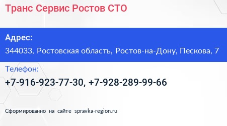 Транс Сервис Ростов, СТО по адресу 344033, Ростовская область, Ростов-на-Дону, Пескова, 7 в дальнейшем Организация, размещена в следующих категориях: