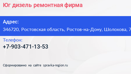 Юг дизель, ремонтная фирма по адресу 346720, Ростовская область, Ростов-на-Дону, Шолохова, 7 в дальнейшем Организация, размещена в следующих категориях:
