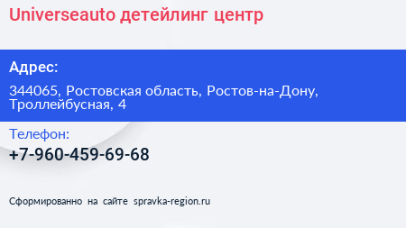 Universeauto, детейлинг-центр по адресу 344065, Ростовская область, Ростов-на-Дону, Троллейбусная, 4 в дальнейшем Организация, размещена в следующих категориях: