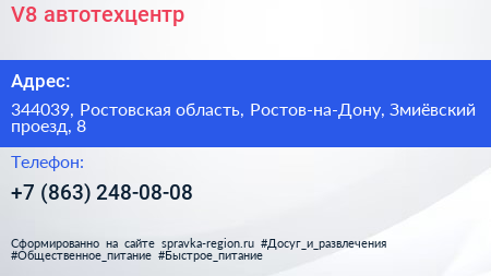 V8, автотехцентр по адресу 344039, Ростовская область, Ростов-на-Дону, Змиёвский проезд, 8 в дальнейшем Организация, размещена в следующих категориях: