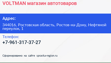 VOLTMAN, магазин автотоваров по адресу 344016, Ростовская область, Ростов-на-Дону, Нефтяной переулок, 1 в дальнейшем Организация, размещена в следующих категориях: