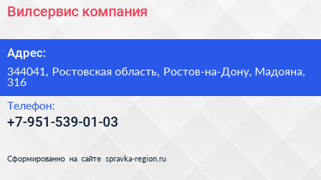 Вилсервис, компания по адресу 344041, Ростовская область, Ростов-на-Дону, Мадояна, 316 в дальнейшем Организация, размещена в следующих категориях: