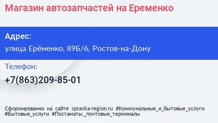 Магазин автозапчастей на Еременко по адресу улица Ерёменко, 89Б/6, Ростов-на-Дону в дальнейшем Организация, размещена в следующих категориях: