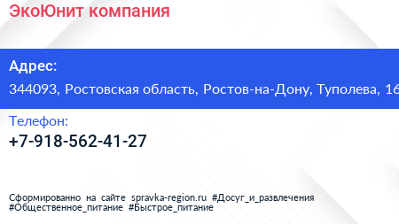 ЭкоЮнит, компания по адресу 344093, Ростовская область, Ростов-на-Дону, Туполева, 16 в дальнейшем Организация, размещена в следующих категориях: