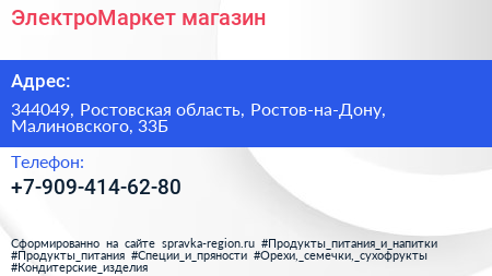 ЭлектроМаркет, магазин по адресу 344049, Ростовская область, Ростов-на-Дону, Малиновского, 33Б в дальнейшем Организация, размещена в следующих категориях: