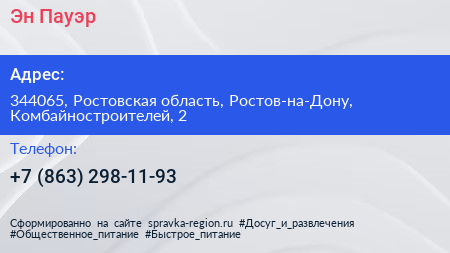 Эн-Пауэр по адресу 344065, Ростовская область, Ростов-на-Дону, Комбайностроителей, 2 в дальнейшем Организация, размещена в следующих категориях: