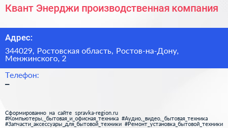 Квант-Энерджи, производственная компания по адресу 344029, Ростовская область, Ростов-на-Дону, Менжинского, 2 в дальнейшем Организация, размещена в следующих категориях: