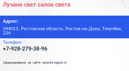 Лучано свет, салон света по адресу 344011, Ростовская область, Ростов-на-Дону, Текучёва, 224 в дальнейшем Организация, размещена в следующих категориях: