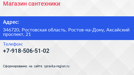 Магазин сантехники по адресу 346720, Ростовская область, Ростов-на-Дону, Аксайский проспект, 21 в дальнейшем Организация, размещена в следующих категориях: