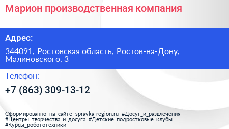 Марион, производственная компания по адресу 344091, Ростовская область, Ростов-на-Дону, Малиновского, 3 в дальнейшем Организация, размещена в следующих категориях: