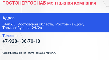 РОСТЭНЕРГОСНАБ, монтажная компания по адресу 344065, Ростовская область, Ростов-на-Дону, Троллейбусная, 24/2в в дальнейшем Организация, размещена в следующих категориях: