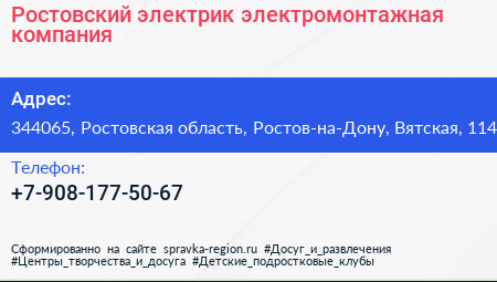 Ростовский электрик, электромонтажная компания по адресу 344065, Ростовская область, Ростов-на-Дону, Вятская, 114 в дальнейшем Организация, размещена в следующих категориях:
