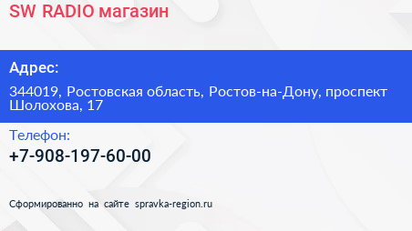 SW-RADIO, магазин по адресу 344019, Ростовская область, Ростов-на-Дону, проспект Шолохова, 17 в дальнейшем Организация, размещена в следующих категориях: