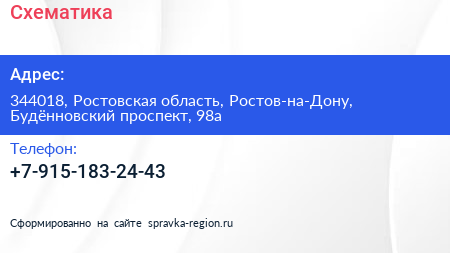 Схематика по адресу 344018, Ростовская область, Ростов-на-Дону, Будённовский проспект, 98а в дальнейшем Организация, размещена в следующих категориях: