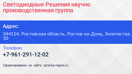 Светодиодные Решения, научно-производственная группа по адресу 344114, Ростовская область, Ростов-на-Дону, Золотистая, 50 в дальнейшем Организация, размещена в следующих категориях: