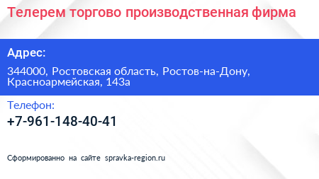 Телерем, торгово-производственная фирма по адресу 344000, Ростовская область, Ростов-на-Дону, Красноармейская, 143а в дальнейшем Организация, размещена в следующих категориях: