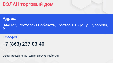 ВЭЛАН, торговый дом по адресу 344022, Ростовская область, Ростов-на-Дону, Суворова, 91 в дальнейшем Организация, размещена в следующих категориях: