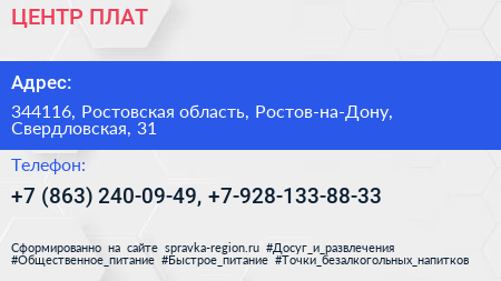 ЦЕНТР-ПЛАТ по адресу 344116, Ростовская область, Ростов-на-Дону, Свердловская, 31 в дальнейшем Организация, размещена в следующих категориях: