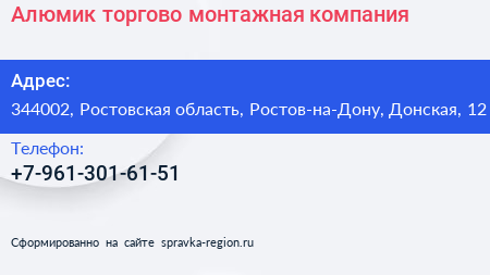Алюмик, торгово-монтажная компания по адресу 344002, Ростовская область, Ростов-на-Дону, Донская, 12 в дальнейшем Организация, размещена в следующих категориях:
