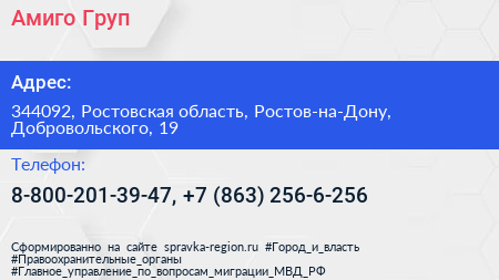 Амиго-Груп по адресу 344092, Ростовская область, Ростов-на-Дону, Добровольского, 19 в дальнейшем Организация, размещена в следующих категориях: