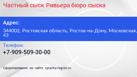 Частный сыск Ривьера, бюро сыска по адресу 344002, Ростовская область, Ростов-на-Дону, Московская, 43 в дальнейшем Организация, размещена в следующих категориях: