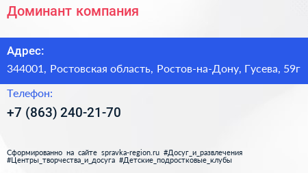 Доминант, компания по адресу 344001, Ростовская область, Ростов-на-Дону, Гусева, 59г в дальнейшем Организация, размещена в следующих категориях: