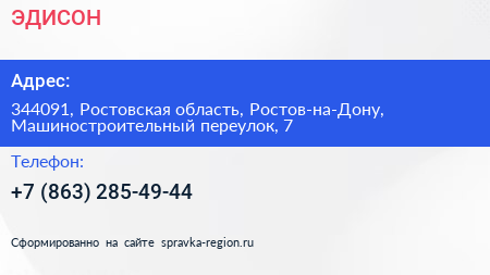ЭДИСОН по адресу 344091, Ростовская область, Ростов-на-Дону, Машиностроительный переулок, 7 в дальнейшем Организация, размещена в следующих категориях: