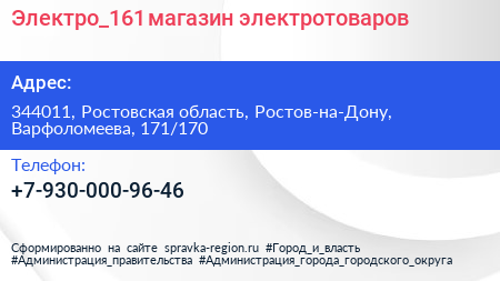 Электро_161, магазин электротоваров по адресу 344011, Ростовская область, Ростов-на-Дону, Варфоломеева, 171/170 в дальнейшем Организация, размещена в следующих категориях: