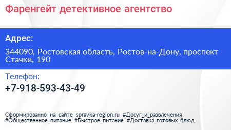 Фаренгейт, детективное агентство по адресу 344090, Ростовская область, Ростов-на-Дону, проспект Стачки, 190 в дальнейшем Организация, размещена в следующих категориях: