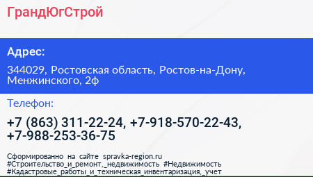 ГрандЮгСтрой по адресу 344029, Ростовская область, Ростов-на-Дону, Менжинского, 2ф в дальнейшем Организация, размещена в следующих категориях: