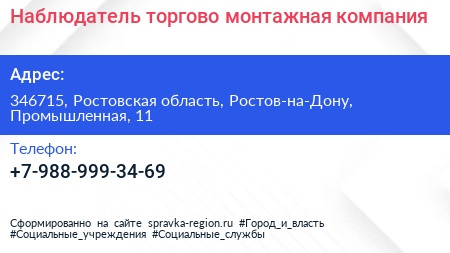 Наблюдатель, торгово-монтажная компания по адресу 346715, Ростовская область, Ростов-на-Дону, Промышленная, 11 в дальнейшем Организация, размещена в следующих категориях: