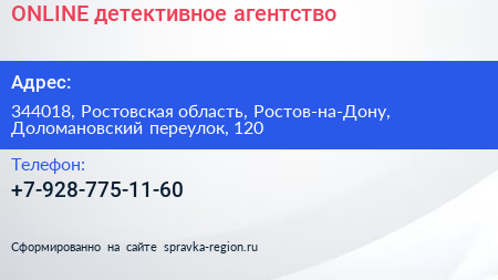 ONLINE, детективное агентство по адресу 344018, Ростовская область, Ростов-на-Дону, Доломановский переулок, 120 в дальнейшем Организация, размещена в следующих категориях: