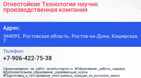 Огнестойкие Технологии, научно-производственная компания по адресу 344091, Ростовская область, Ростов-на-Дону, Каширская, 7 в дальнейшем Организация, размещена в следующих категориях: