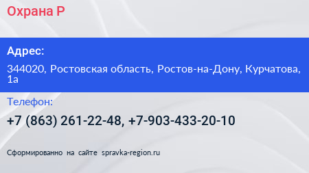 Охрана-Р по адресу 344020, Ростовская область, Ростов-на-Дону, Курчатова, 1а в дальнейшем Организация, размещена в следующих категориях: