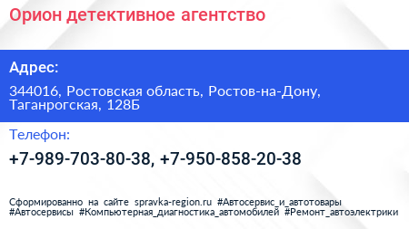 Орион, детективное агентство по адресу 344016, Ростовская область, Ростов-на-Дону, Таганрогская, 128Б в дальнейшем Организация, размещена в следующих категориях: