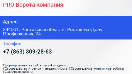 PRO Ворота, компания по адресу 344001, Ростовская область, Ростов-на-Дону, Профсоюзная, 74 в дальнейшем Организация, размещена в следующих категориях: