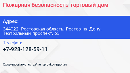 Пожарная безопасность, торговый дом по адресу 344022, Ростовская область, Ростов-на-Дону, Театральный проспект, 63 в дальнейшем Организация, размещена в следующих категориях: