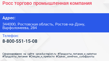 Росс, торгово-промышленная компания по адресу 344000, Ростовская область, Ростов-на-Дону, Варфоломеева, 284 в дальнейшем Организация, размещена в следующих категориях: