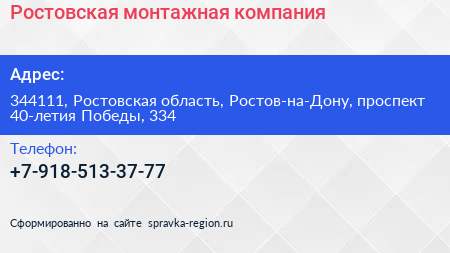 Ростовская монтажная компания по адресу 344111, Ростовская область, Ростов-на-Дону, проспект 40-летия Победы, 334 в дальнейшем Организация, размещена в следующих категориях: