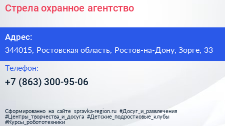 Стрела, охранное агентство по адресу 344015, Ростовская область, Ростов-на-Дону, Зорге, 33 в дальнейшем Организация, размещена в следующих категориях: