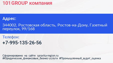 101 GROUP, компания по адресу 344002, Ростовская область, Ростов-на-Дону, Газетный переулок, 99/168 в дальнейшем Организация, размещена в следующих категориях: