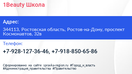 1Beauty-Школа по адресу 344113, Ростовская область, Ростов-на-Дону, проспект Космонавтов, 32в в дальнейшем Организация, размещена в следующих категориях: