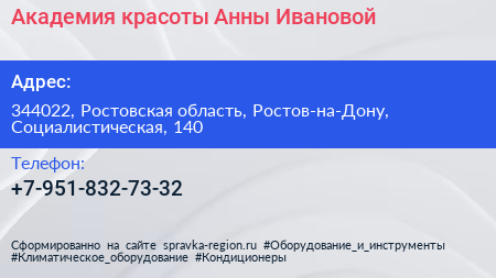 Академия красоты Анны Ивановой по адресу 344022, Ростовская область, Ростов-на-Дону, Социалистическая, 140 в дальнейшем Организация, размещена в следующих категориях: