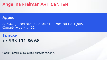 Angelina Freiman ART CENTER по адресу 344002, Ростовская область, Ростов-на-Дону, Серафимовича, 61 в дальнейшем Организация, размещена в следующих категориях: