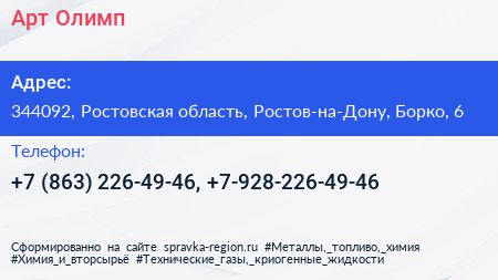 Арт Олимп по адресу 344092, Ростовская область, Ростов-на-Дону, Борко, 6 в дальнейшем Организация, размещена в следующих категориях: