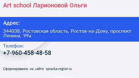Art school Ларионовой Ольги по адресу 344038, Ростовская область, Ростов-на-Дону, проспект Ленина, 99а в дальнейшем Организация, размещена в следующих категориях: