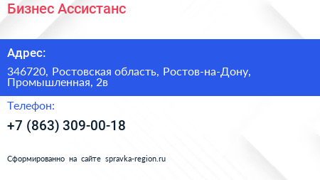 Бизнес-Ассистанс по адресу 346720, Ростовская область, Ростов-на-Дону, Промышленная, 2в в дальнейшем Организация, размещена в следующих категориях: